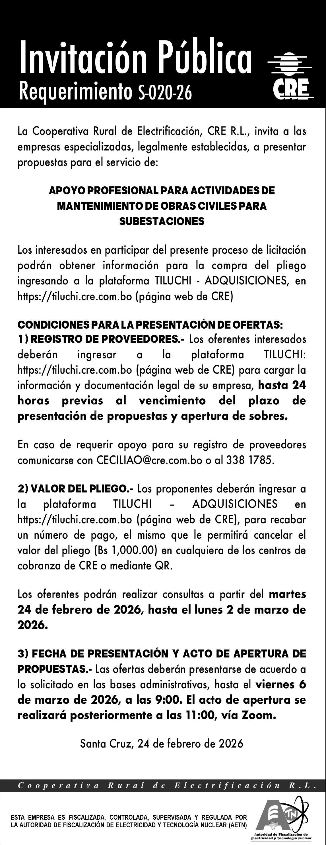 S-020-26 - APOYO PROFESIONAL PARA ACTIVIDADES DE MANTENIMIENTO DE OBRAS CIVILES PARA SUBESTACIONES