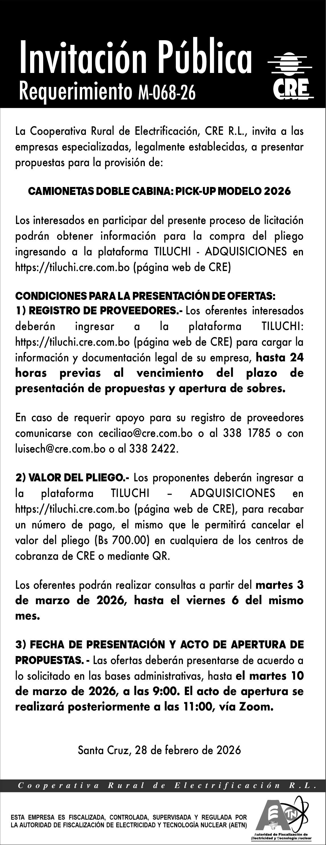 M-068-26 - PROVISION DE CAMIONETAS DOBLE CABINA: PICK-UP AÑO 2026